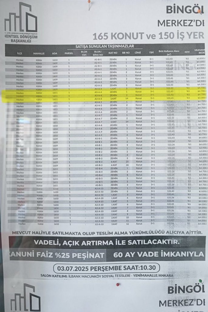 Bingöl’de konut ihtiyacının giderek arttığı, buna bağlı olarak kira fiyatlarının yükseldiği bir dönemde TOKİ, Kültür Mahallesi’nde inşa edilen konutlardan 165’i ile zemin katlarda yer alan 150 işyerinin satış ilanını yayımladı. Satışların, 3 Temmuz 2025 Perşembe günü saat 10.30’da salon katılımı ve internet üzerinden teklif verme yoluyla yapılacağı bildirildi.Yüzde 25 peşinat şartının bulunduğu satışlarda, vade süresi ise 60 ay olarak belirlendi. İlanda, “mevcut haliyle satılmakta olup, teslim alma yükümlülüğü alıcıya aittir” notuna da yer verildi. Muhammen bedel konutlarda 1 milyon 500 bin TL’den başlarken, işyerlerinde bu rakam 3 milyon 750 bin TL’den başlayacak. Açık artırmalar bu rakamlar üzerinden yapılacak.Açık artırmaya katılım, Ankara’daki İLBANK Macunköy Sosyal Tesisleri ve İstanbul’daki TOKİ Hizmet Binası’ndan fiziki olarak yapılabileceği gibi, www.emlakmuzayede.com.tradresinden çevrim içi olarak da gerçekleştirilebilecek. Ayrıntılı bilgiye ise www.toki.gov.tr, www.emlakmuzayede.com.trinternet adreslerinden ve 444 84 34 numaralı telefondan ulaşılabilecek.Muhammen bedeli 3 milyon 750 bin TL’den başlayıp 6 milyon 250 bin TL’ye kadar çıkan konutların, açık artırmasız ve yılda iki kez uygulanacak enflasyon farkı olmadan aylık taksitleri ise 60 bin TL’den başlıyor.İşyeri fiyatlarının konutlara göre daha uygun olduğu görülse de, küçük metrekareler nedeniyle yatırımcılar açısından cazibesini yitirdiği ifade ediliyor.Öte yandan, daha önce kamuoyuna açıklanan bilgilerde 239 konut ve 192 ticari alanın satılacağı belirtilmişti. Ancak yayımlanan ilanda 165 konut ve 150 işyerinin satışa çıkacağı bildirildi. Kalan 74 konut ve 42 işyerinin akıbeti merak edilirken, bunlardan 16 konut ve 5 işyerinin daha önce kamulaştırma bedelini borçlanmayla ödeyen Bingöl Belediyesi’ne devredileceği öğrenildi. Belediye, devir işlemlerinin tamamlanmasının ardından bu taşınmazları da satışa çıkaracak.